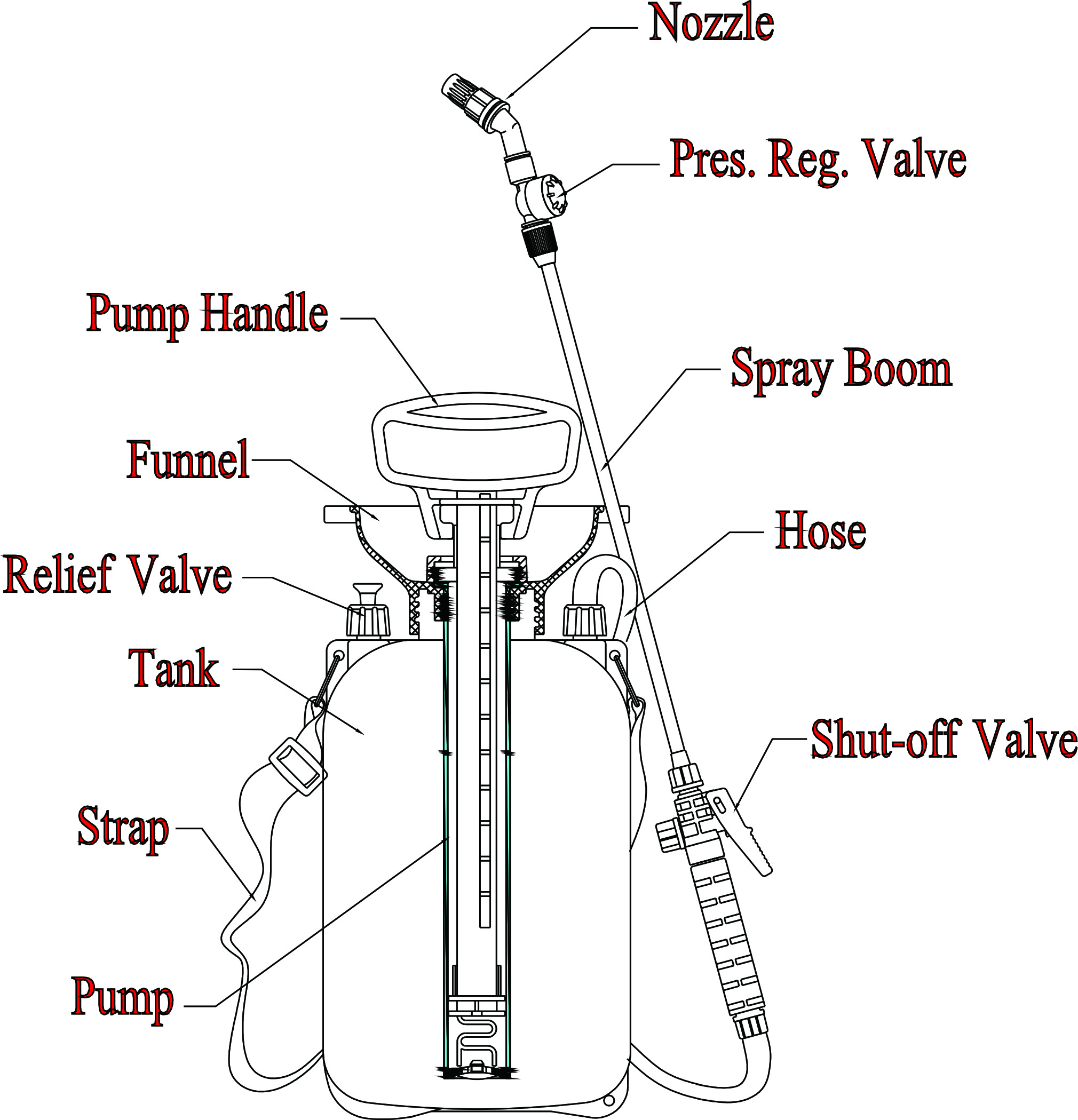 يتكون من خزان، وحدة مضخة (أسطوانة، مقبض، مكبس وما إلى ذلك)، مجموعة رش (خرطوم، إغلاق، أنبوب رش وفوهة)، صمام تخفيف، حزام، إلخ.